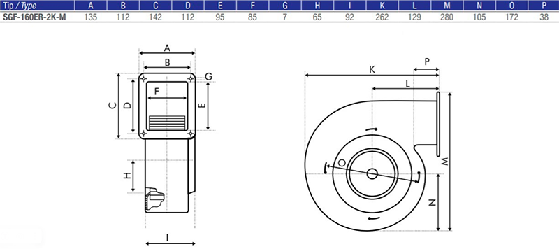 - Тип: радиальный (центробежный), крыльчатка с загнутыми вперёд лопатками.